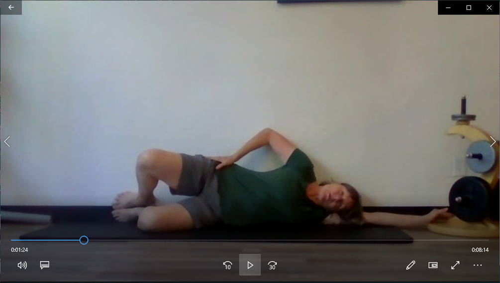 9-minutes. A series of strengthening exercises for the lateral hip and deep rotators of the pelvis. Exercises are performed side-lying against a wall to support the body in alignment and better focus the exercises.